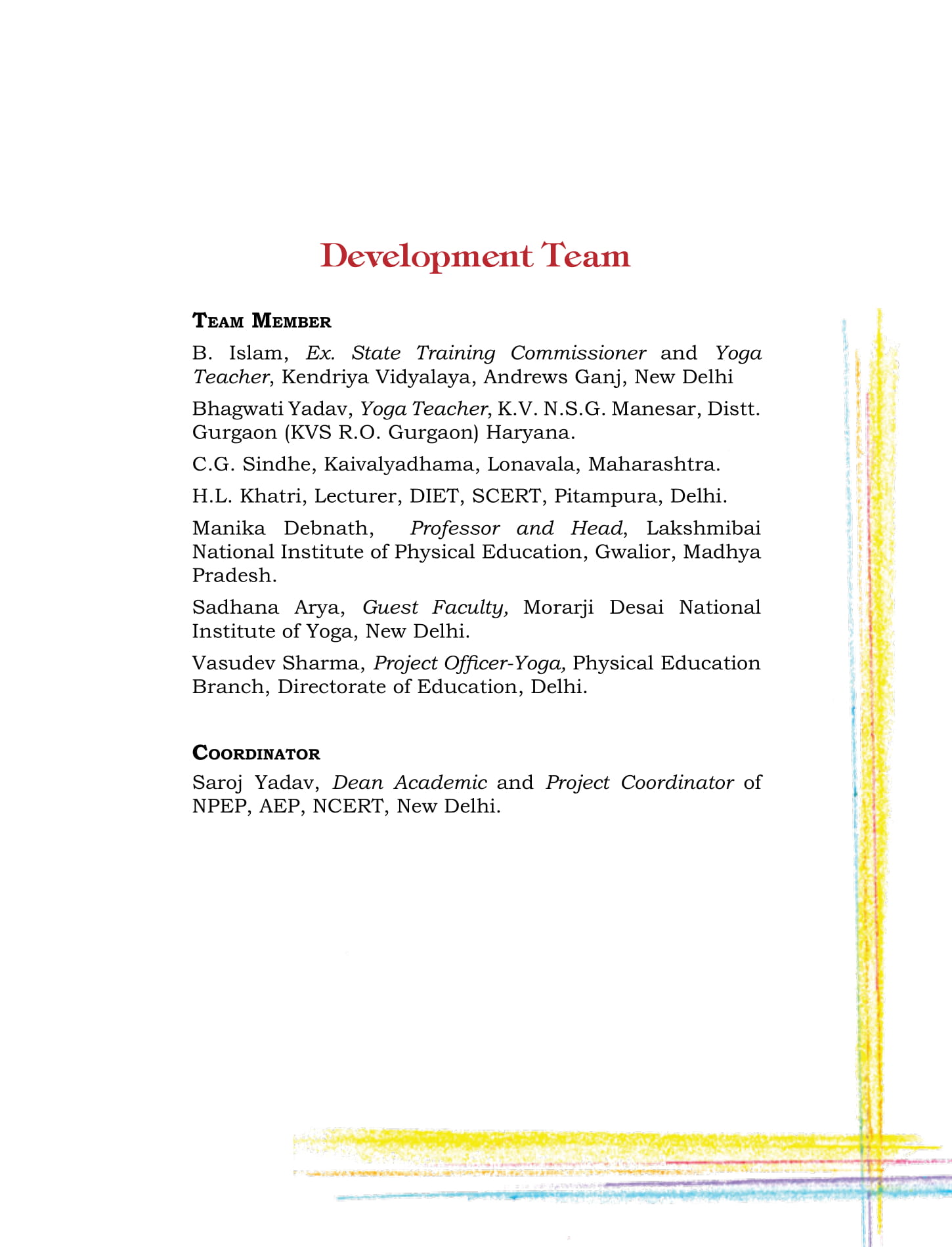 Dr. B. Islam former Yoga researcher, Yoga Teacher and State Training Commissioner KVS BS&G Ministry of HRD Govt of India selected at National Level to contribute as one among the seven Yoga experts of India as member of “development team” of Yoga syllabus and textual material in English language for Class VI to VIII in the aegis of NCERT (National Council for Education Research and Training) Ministry of HRD Govt of India. As coauthor Dr. Islam did his best to develop the textual material which was published in the form of textbook. From his field Dr. Islam was also representing thousands Yoga faculty members of Government of India Institution (KVS/ NVS/ States Schools).